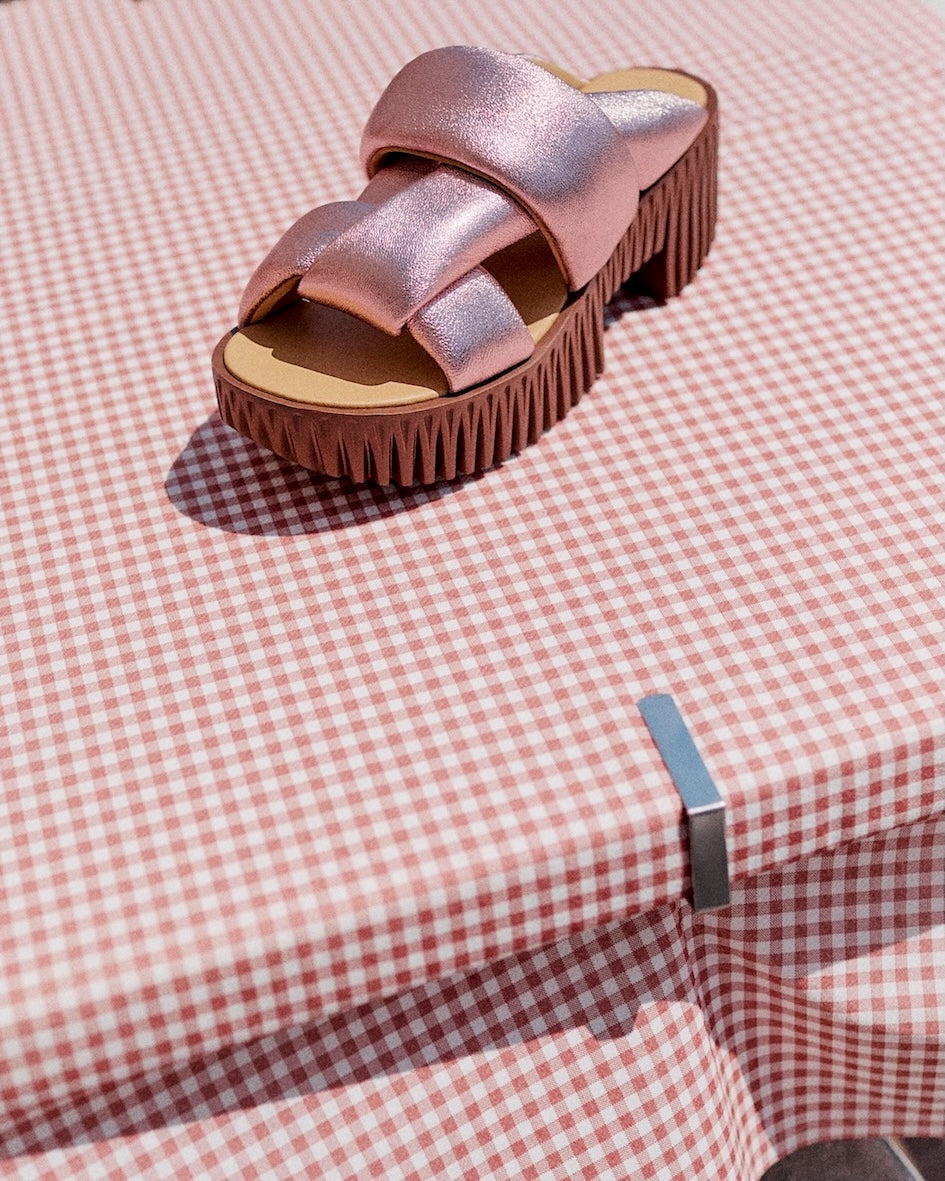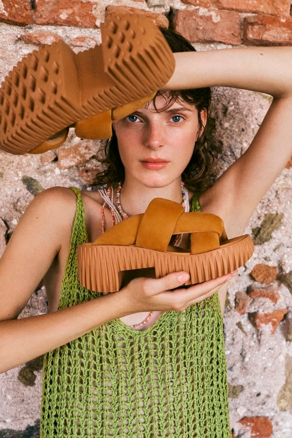 PLIA, una reinterpretación vanguardista de los tradicionales zuecos de madera, ofrece un estilo moderno gracias a su plataforma voluminosa pero ligera con bloques tallados. La textura acanalada de la base recuerda las formas orgánicas de las cabezas de diente de león, las láminas de los hongos y la corteza de los árboles. Confeccionada en espuma de goma, esta sandalia es una interpretación moderna y exquisita de una silueta clásica.