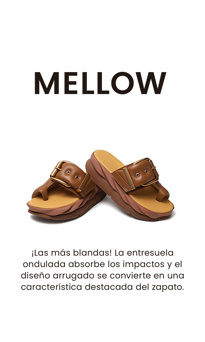 Inspirada en la forma ondulada de los pétalos de una flor o la textura de la crema batida, la suela de la MELLOW se divide en dos partes; una base resistente y firme junto a una parte superior más suave y acolchada, ofreciendo una excelente absorción de impactos y durabilidad.