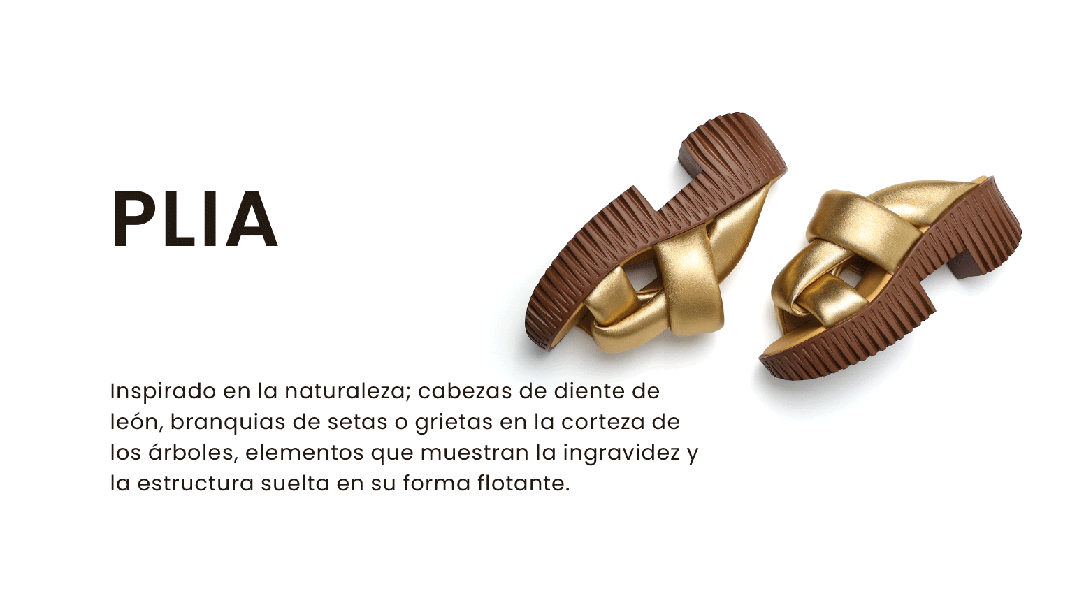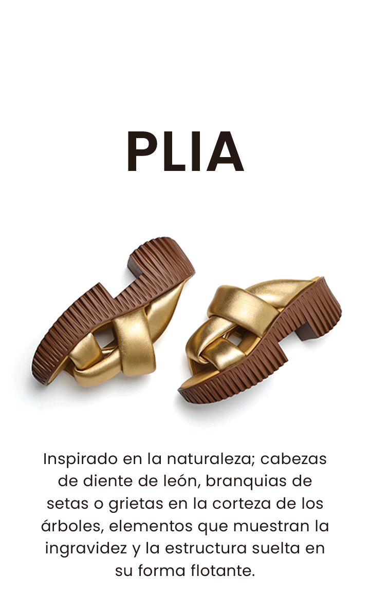 Tallada en goma espuma que imita texturas naturales como las cabezas de diente de león y las laminillas de los champiñones, PLIA representa ligereza y frescura. Inspirada en los tradicionales zuecos de madera robustos, la base del zapato combina materiales flexibles y modernos con una silueta voluminosa.